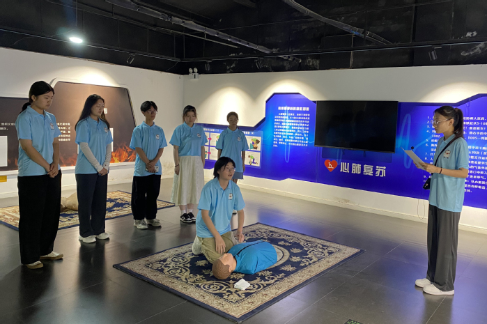 揭牌仪式结束后,同学们在场馆老师的带领下,了解了生命从单细胞生物到复杂生物的演化过程,以及人类从原始社会到现代社会的历史发展,同时通过观察生动逼真的展品和场景,同学们对生命的起源和进化有了更为直观的理解。学生代表程宇昕和敖书涵详细地向在场人员讲解和演示了相关急救知识。讲解过程中,她们特别强调胸外心脏按压和人工呼吸中需要注意的关键细节,并亲自示范,激发大家的学习兴趣,随后在场人员纷纷踊跃到模型面前进行现场情况的实战模拟。模拟过后,大家互相探讨,互相学习。通过这次急救知识宣讲,同学们不仅学到了很多关于CPR的知识,而且巩固了专业理论知识。