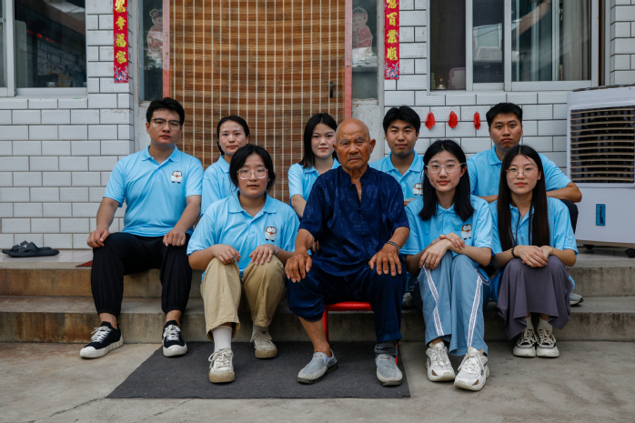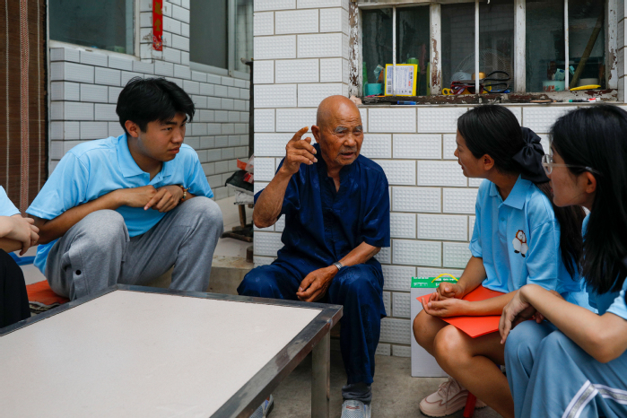 游学团出发前往姚村镇寻访红旗渠建设者,经过一路探寻来到姚村镇翟底村,找到了当年红旗渠建设者常计林老人,常老今年已经90岁高龄,但给成员们讲到当年修渠故事时自豪不已、慷慨激昂。常老从修渠的背景、修渠故事及修渠之难娓娓道来,大旱、连旱、凶旱......小米加野菜、甚至吃树皮,面对这样的困难境遇,空有一身劲的他在1958年加入到修渠队伍中,这一修就是10年,10年间他过家门而不入,吃住在石缝。修渠过程中最难的就是所有的修建全部都是靠人工,所有的修渠用料只通过人工搬运和毛驴运送,修渠过程异常艰辛。讲到在修渠中“老炮眼”时,常老多次哽咽讲不下去,因为他亲眼见到了炸药爆破中被炸得血肉模糊的身躯。当团队成员向常老表示都是00后时,他不禁感慨道,他们都生在了好时代,以前的苦日子已不复再来,也希望孩子们都能成为国家栋梁之才。最后,常老表示游学团来得巧,当天恰逢自己90岁生日,回忆和自己一起修渠的杨贵、任羊成等都已离世,心中难免伤感,但是红旗渠精神将永垂不朽。