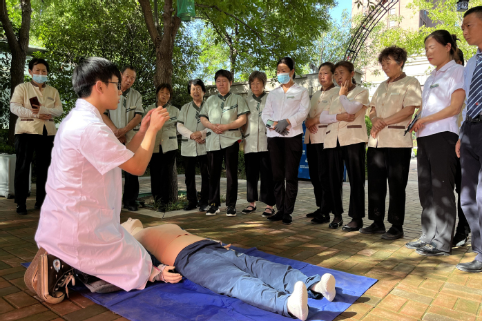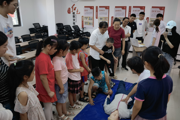 7月11日下午,实践团队成员在社区进行急救知识的宣讲,现场为大家展示了胸外按压、人工呼吸等心肺复苏技术手法,告诉大家遇到突发事件如何第一时间作出反应,如何抓住急救的“黄金4分钟”。不仅如此,成员们还详细普及了海姆立克急救法,对急救步骤进行了讲解演示。最后,居民现场进行应急救护演练,成员们在旁边指导。宣讲结束后,参训的社区居民对成员们说:“感谢社区和学校提供了这个机会,让我们了解了基本的救护知识和技能,在关键时刻能够自救同时也能为他人提供帮助,希望学校日后能多举办一些这样的活动,我们也能够跟随志愿者们学到更多的医疗知识。”
