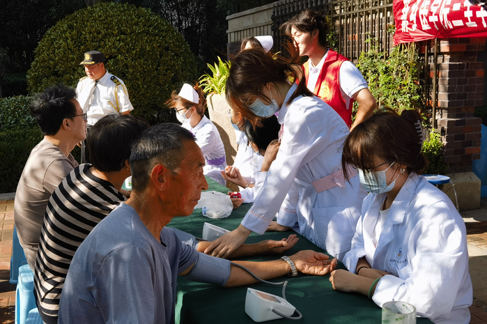 7月10日,为了帮助居民及时掌握自己的健康情况,做到疾病早发现、早预防、早治疗,实践团队挑选专业人员组成义诊队伍,前往凤翔社区为居民测血压、血糖。实践团队成员提前学习测量血压血糖的方法,并且查询相关资料,做足了前期的准备工作。活动现场,义诊队伍现场悬挂宣传横幅,在义诊摊位上接待前来咨询的居民。“大爷,您不要急,慢慢说,我先帮您测一下血压。”队员们通过“拉家常式”的问诊方式,热情细致地询问老人的既往病史和日常习惯,有条不紊地为他们量血压、测血糖,并指导居民如何正确使用家用血压测量仪。成员们一边测量一边也不忘嘱咐居民定期检查身体的重要性,鼓励居民养成健康的生活习惯。