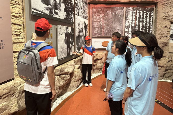 下午,团队成员来到红旗渠纪念馆进行参观学习。走进纪念馆内,一幅幅珍贵的历史照片、一个个沙盘模型、当年修渠工人们用过的提灯、开凿工具,再现了红旗渠精神形成和发展的全过程。“青”风展红旗宣讲队成员蔡沛霖、王军权自愿化身讲解员,为大家生动讲述修渠故事,带领大家身临其境地感受林州人民建造人工天河时不畏艰险,顽强拼搏,艰苦奋斗的那段峥嵘岁月,让团队成员感悟到没有十万林县人民十年的浴血奋战,就没有今天日新月异的林州。宣讲队成员们通过研学实践,亲身感受到了红旗渠的宏伟浩大,深刻领悟了“自力更生、艰苦创业、团结协作、无私奉献”的红旗渠精神,同时也为之后的宣讲活动积累了更多的理论知识。
