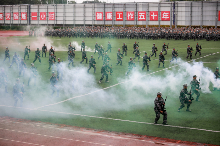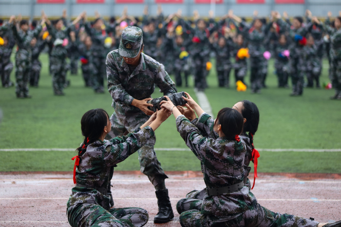 擒敌拳一招一式精准有力、气势震天;女子特种匕首操刺闪挥劈挡、铿锵有力,尽显巾帼飒爽英姿;刺杀操刀光凛冽、气势如虹;旗语方阵动作整齐划一,他们虎虎生威的气势,团结协作的精神,展现了三全学子蓬勃的朝气;战术方队攻防演练、人质解救、歹徒擒拿、战场救护,闪耀着热血和坚毅的青春光芒。