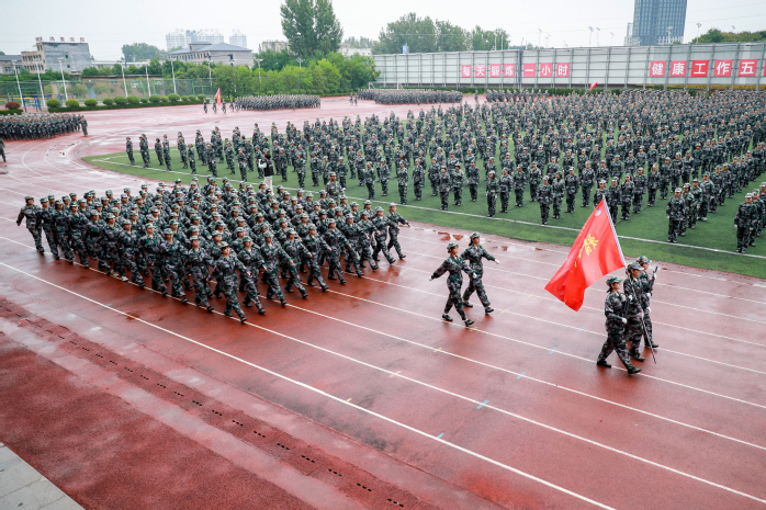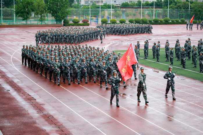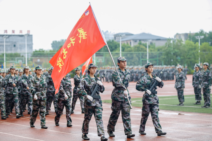 大会首先举行2023级新生军训汇报演出。国旗护卫队高举五星红旗,6个书院营队18个连队1800余名军训新生,迈着整齐的步伐依次通过主席台接受检阅,他们队列整齐、军姿笔挺、目光坚定、口号响亮,赢得现场阵阵掌声。
