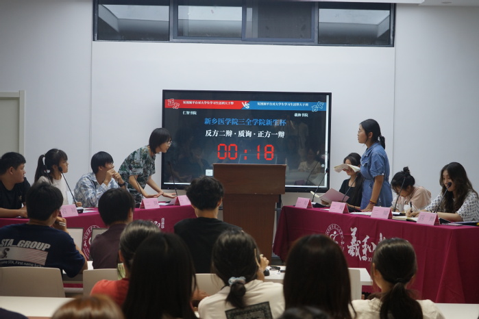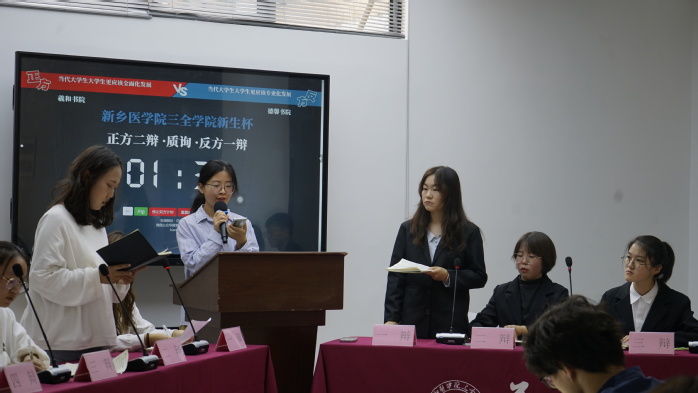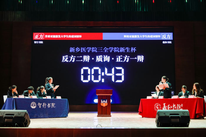 辩论,是语言与思想的碰撞,是智慧与灵感的交融。为教育引导2023级新生适应大学生活、尽快完成角色转变,同时助力其形成树立坚定的理想信念和爱国情怀,羲和书院联合通识教育学院共同举办了“启航‘全’世界,‘辩’响爱国情”新生杯辩论赛。决赛于10月31日下午,于闻德礼堂顺利落下帷幕,新乡医学院三全学院副院长薛宏、党委宣传部副部长王德胜、图书馆陈燕、校团委史良等出席担任评委,学务部副主任兼团委书记马素娟、羲和书院党总支副书记刘小磊等相关领导嘉宾出席本次活动,各书院六百余名新生参加观摩。