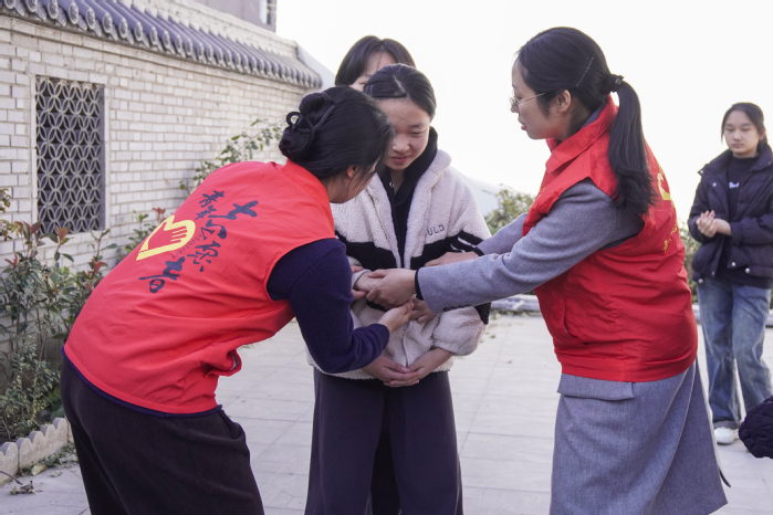 中间休息时,师生志愿者不仅手把手教他们七步洗手法和海姆立克急救法,还带着孩子们玩老鹰抓小鸡的游戏。“站在受助者身后,用一只手握住拳头,将拳头置于患者的腹部上方,另一只手放在拳头上,用身体重量施加向下压力……”孩子们学得非常认真,尤其是海姆立克急救法普及的时候,几个女孩还两两结伴地进行演示、讲解。