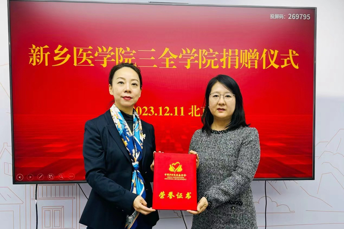 李琼院长首先对三全学院做了详细介绍,并表示三全学院非常认同中国乡村发展基金会在公益事业领域的宗旨、理念、以及影响力和执行力,通过向中国乡村发展基金会捐款也是学院支持公益事业发展,积极承担社会责任的一次具体行动。赵溪花主任感谢三全学院对中国乡村发展基金会及公益事业的支持,并就中国乡村发展基金会发展历程、业务范围等做了简要介绍,表示三全学院与中国乡村发展基金会关于人才培养的理念不谋而合,希望双方今后会有更深入的合作。赵溪花主任向李琼院长颁发荣誉证书。