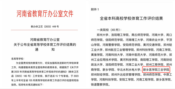 近日河南省教育厅下发《河南省教育厅办公室关于公布全省高等学校体育工作评价结果的通知》(教办体卫艺〔2023〕449号),我校在全省155所高等学校的体育工作现场评价中,获评一类院校,这是对我校全面贯彻党的教育方针,切实加强和改进新时代学校体育工作,构建德智体美劳全面培养的教育体系的综合评价。
