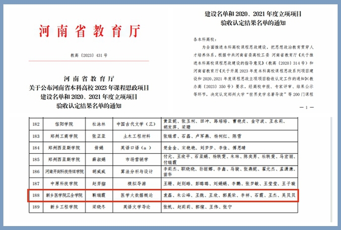 12月27日,河南省教育厅发布《关于河南省2023年本科高校课程思政项目建设名单和2020、2021年度立项项目验收认定结果名单的通知》(教办高〔2023〕431号),其中,我校《医学大数据概论》课程被认定为省级课程思政样板课程,同时课程授课团队被认定为省级2023年本科高校课程思政教学团队。