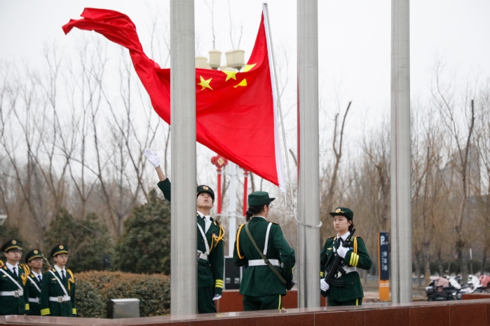 早上7时许,伴随着指挥员的口令,英姿飒爽的国旗护卫队队员迈着铿锵的步伐,护送着鲜艳的五星红旗来到国旗台下。随后,国歌奏起,旗手振臂一挥,在场全体师生向国旗行注目礼,在振奋人心的国歌声中,国旗冉冉升起,飘扬在校园上空。