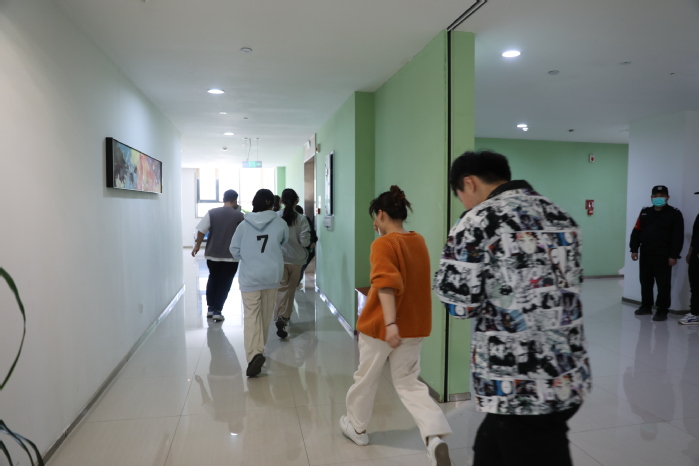 参加演练的师生在疏散引导人员的引导下,弯着腰、用手帕捂住口鼻沿着疏散通道分别从图书馆大楼北面东西两端疏散楼梯进行疏散,用时5分钟分别撤离至图书馆大楼东西广场。