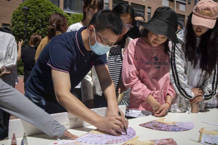 随后,伴随着悠扬的古琴声,甘棠汉服社成员身着各具特色的汉服依次出场进行汉服展示,引发了现场师生的一片欢呼和掌声。在自由活动环节,同学们踊跃参与了自制书签、石膏涂鸦、套圈与非遗漆扇制作等项目,活动现场欢声笑语,同学们在丰富多彩的活动中体会了传统文化的魅力。刘芮同学现场演示了书签的制作过程,用笔在书签上写下“多喜乐,长安宁”六个字,寄托祝愿大家生活都喜乐安宁的深意。另一边,在历史人物石膏人涂色活动中,康博同学选中了李白的石膏形象,因为特别欣赏李白‘仰天大笑出门去,我辈岂是蓬蒿人’的豁达。非遗漆扇制作最受学生欢迎,同学们领取空白扇子后在活动摊位前排起了长队,空白的扇子浸入水中又取出便成为了精美的艺术品,无论男生还是女生都爱不释手。