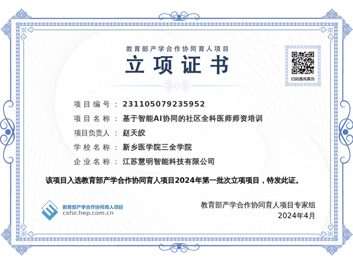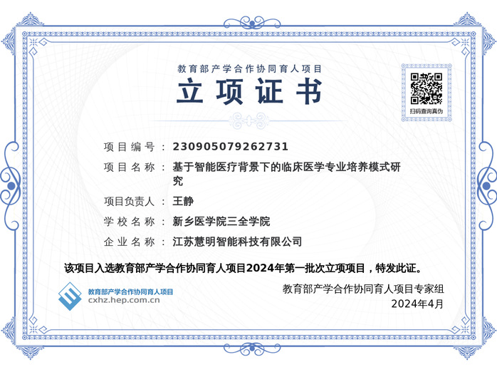 近日,教育部高等教育司发布了《关于公布2024年第一批产学合作协同育人项目立项名单的通知》,我校副院长薛宏主持的《基于OBE理念和雨课堂的“写作与沟通”课程混合式教学改革与研究》、临床学院赵天皎主持的《基于智能AI协同的社区全科医师师资培训》和临床学院王静主持的《基于智能医疗背景下的临床医学专业培养模式研究》项目成功获批,共获经费支持37万。