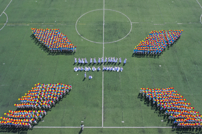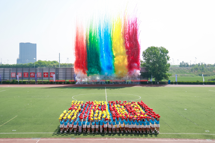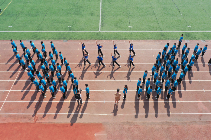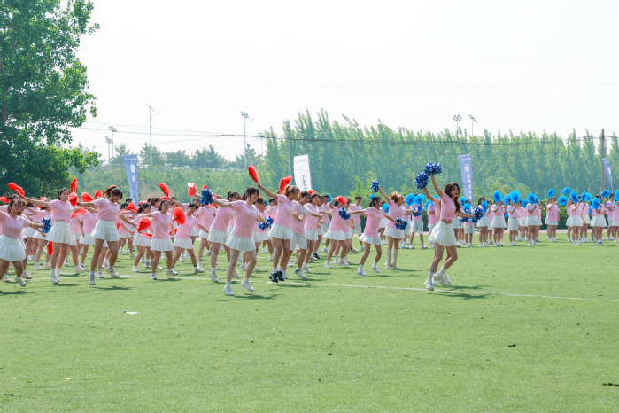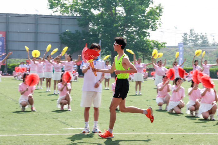 随后,精彩的团体操表演为春日校园带来了一场绝美的视觉盛宴。青年学子们通过“排兵布阵”的方式,向新中国成立七十五周年献礼,表达对祖国母亲的热爱。 由智行,羲和,精诚三个书院组成的特色方队带来了“热辣滚烫  青春当燃”为主题的团体操展示,分为青春为伴、恒心致远、未来可期、不负韶华四个篇章。他们在操场上肆意奔跑,展现自我。不断变化的方队,组成了冉冉升起的太阳,象征着希望、生命、力量与生机。彩带组成的奥运五环,展示了运动员以公正、坦率的比赛和友好的精神在赛场上相见。