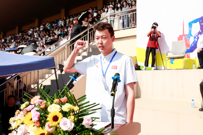 运动员代表梁春泰宣誓:“坚决遵守纪律,听从指挥,服从裁判。秉承友谊第一比赛第二重在参与的理念。赛出风格赛出水平赛出成绩,发扬更高更快更强更团结的现代奥林匹克精神