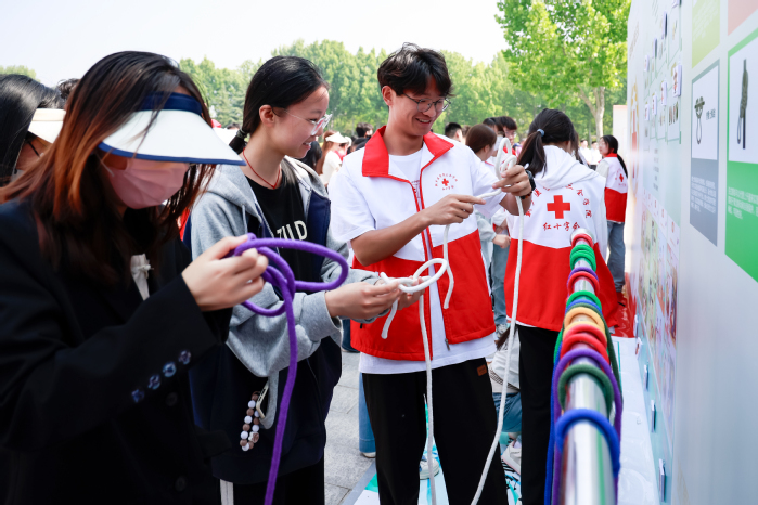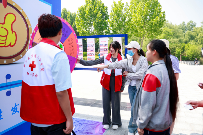 随后,活动嘉宾与师生沉浸式参观、体验了“人道精神 生生不息”主题展在讲解员的带领下,与会人员依次了解了红十字运动起源、中国红十字会发展历程、三救三献知识科普、三全学院红十字会开展情况,分享发生在身边有温度、有情怀、有力量的红十字故事。在互动环节,校红十字会志愿者通过现场演示向师生传授了心肺复苏、海姆立克急救法等基本急救技能。德馨书院学生将心肺复苏操作要领融入舞蹈,为到场观众演绎了一场自编自导、生动有趣的急救操表演。表演结束后,现场师生踊跃参加进行演练,志愿者们耐心细致地分解动作,讲解要领,用他们的爱心、耐心手把手地传授给师生们心肺复苏和海姆立克急救技术。签名留言、看图猜字、趣味结绳和爱心转盘等游戏互动的形式,也吸引师生驻足观看和体验,在活动参与中进一步感受红十字精神。