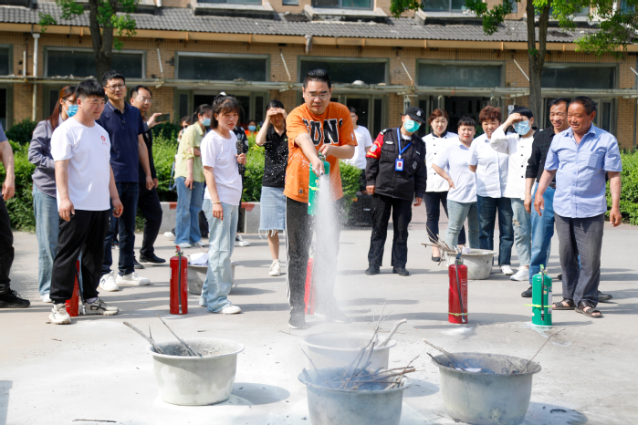 讲座结束后,参训人员在东苑餐厅西广场进行了灭火实操演练,现场学习如何使用灭火器等专业消防设备。