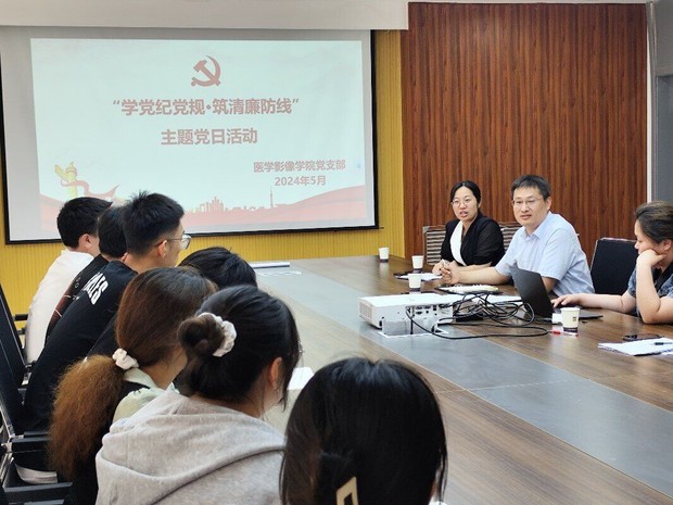 在医工楼四楼会议室,薛宏副院长参加了医学影像学院党支部“讲党课”之“砥砺担当作为 履职尽责勇挑重担”活动。他带领师生学习共同学习了《中国共产党纪律处分条条例》,领学了《条例》第二编第六章《对违反政治纪律行为的处分》的部分内容。在领学过程中,他逐条对条例内容进行解读,并结合廉政案例对师生党员进行教育。他希望老师们对照《条例》规范自身行为,养成良好的修养和习惯,并对所有党员老师提出五点要求,一是坚决纠治形式主义、官僚主义;二是督促干部勇于担当、积极作为;三是促进党员履职尽责、规范用权;四是推动精准问责;五是推动精准问责。做到严守党的纪律,积极参加党的民主生活会,从思想深处剖析自己,开展批评与自我批评,在工作中不断完善、不断进步。在利益诱惑面前始终不忘党的纪律,不忘初心,坚守本心,做一名知纪、畏纪、守纪的合格党员。