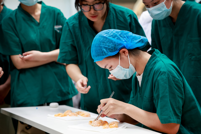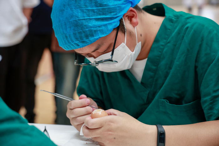说起比赛外场生动有趣、寓教于乐的设计,本次大赛负责人苗莹莹介绍,手指的灵活度对于手术的精准度尤为关键。用细小的木棒夹豆子,可以达到锻炼手指灵活性及对力量的控制的目的;分离相邻沃柑瓣犹如锻炼我们在外科操作中组织间隙分离,通过锻炼可以保证手术精准度;用器械剥生鸡蛋对提升微创手术技能有很大帮助,用这种方法训练,对手、眼、脑的协调配合以及手指力度的精准掌控很有用。