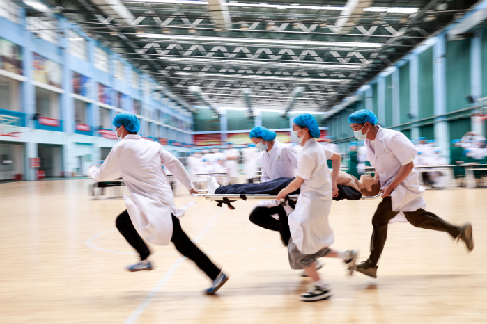 决赛伊始,主持人宣布比赛流程规则,比赛拉开帷幕。比赛共分三个环节,第一项活动为医学长征。同学们用标准化的动作对模拟人进行心肺复苏,复苏完毕把模拟人搬上担架紧急送病人进行高级生命支持。第二环节为我是医学大侦探。每个队伍根据给出病例分析的线索给出临床诊断。同学们敏锐的洞察力及超强的语言表达能力受到了在场观众的一致好评。第三个环节为炉火纯青,旨在考验选手的双手的灵敏度及力量控制,为未来外科手术打下坚实基础。本环节分为三部分,第一部分限时接力用木棒夹黄豆。第二部分为限时用镊子接力分离沃柑瓣。第三部分为限时用器械剥生鸡蛋,可以提升手术技能,修炼耐心和毅力。