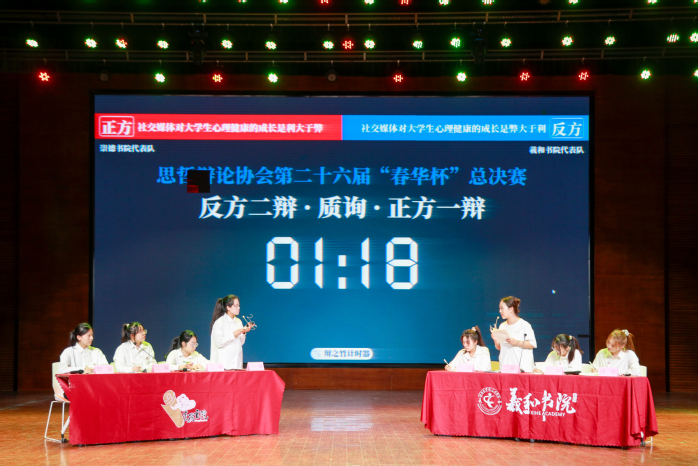 经过选拔赛、初赛与半决赛11场的激烈比拼,最后羲和书院代表队和崇德书院代表队晋级决赛,决赛以“社交媒体对大学生心理健康利大于弊还是弊大于利”为辩题,在辩论中,作为正反双方的各自坚定地持己方观点,巧妙运用现实案例和论文数据,通过激烈的辩论表达各方的观点和看法。