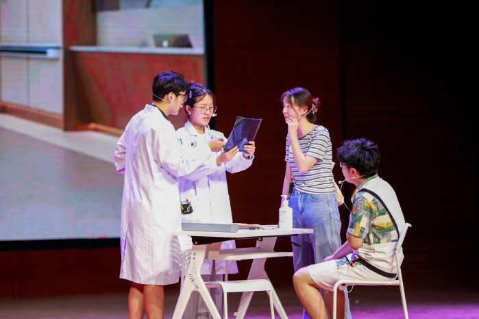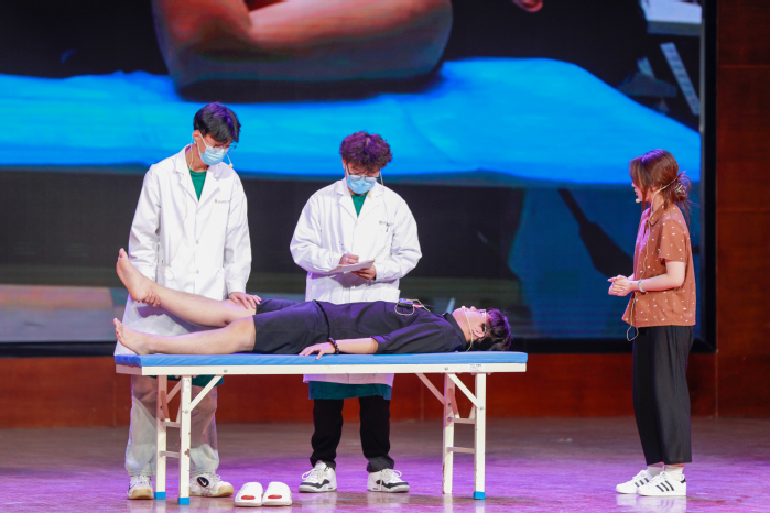 整场比赛松紧有秩,选手们专业的手法,精彩的表现赢得观众阵阵掌声。第一组是来自精诚书院的“说的都队”队。他们通改编情景剧《两个120》,对心肌梗死的检查、诊治、预防进行宣讲,展现了医务工作者认真负责的态度,追求完美的信念;第二组是来自智行书院的“披荆斩棘的医学生”队。通过改编情景剧《护心大挑战》,对先天性心脏病的检查、诊治、预防进行宣讲,展现了医务工作者全心全意为患者服务的职责;第三组是来自智行书院的“医路先锋”队。自古信任是基石,家庭是关键,《转变》讲述了医患间的刻板印象的转变,展现医务工作者对于工作的尽职尽责不计前嫌的无私奉献;第四组是来自智行书院的“医心向未来”队。他们演绎的《生命之争》让我们意识到哮喘性休克的危害。通过问诊、听诊、心肺复苏等多项临床技能,展现出了临床医生的临危不乱,认真细致的意志品质;第五组是来自崇德书院的“医往无前”队。他们带来的是对疾病“冠心病”改编的情景剧《最炫医学风》。旨在通过跌宕起伏的故事情节,向观众展示医学领域的风采,传递医者仁心、救死扶伤的医学精神;第六组是来自智行书院的“医身戎装”队。他们带来以疾病“肺水肿”改编的情景剧《当那一天真的来临》,演绎战场急救包扎等医疗处置;最后一组出场的是来自羲和书院的“医心医毅”队。通过疾病“肺癌”改编的情景剧《别拖了》,告诫大家任何疾病的治疗效果关健在于早发现、早诊断、早治疗,展现了医务工作者对患者生命健康负责的责任感和以救死扶伤为己任的医者仁心。