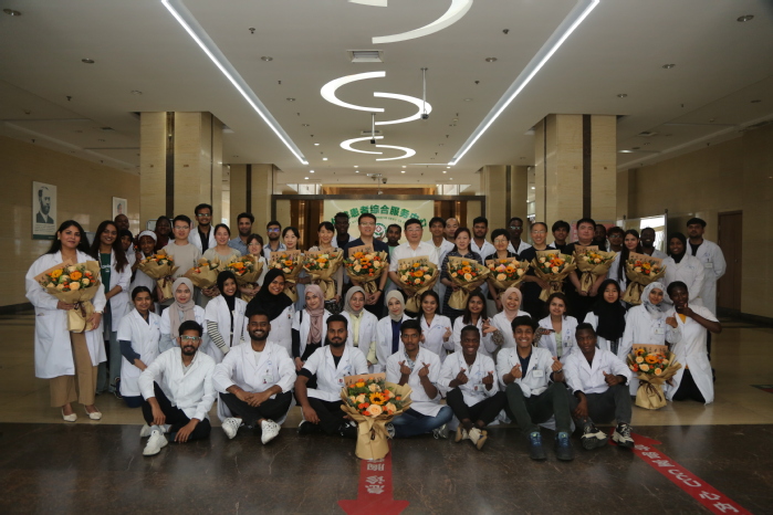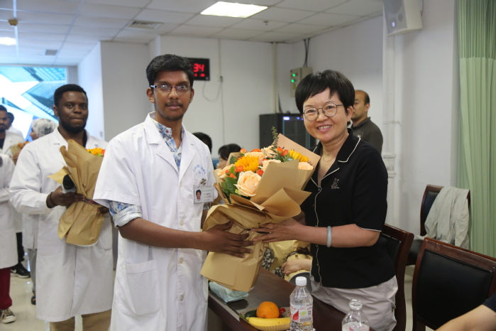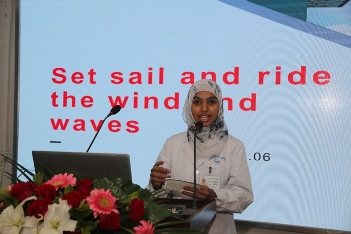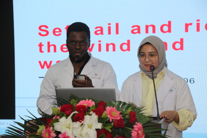 紧接着,来自印度、印度尼西亚、坦桑尼亚、加纳四个国家的2018级学生代表纷纷发言,深情地表达了对医院带教老师一年来悉心指导的感激之情,以及对学校持续关心和支持的感谢。他们表示,在踏入新的征程阶段,老师们的肯定和支持,给予了他们无比的信心,他们将竭尽所能,为世界医学事业贡献自己的力量;他们将做好中国和自己国家发展的桥梁和使者,共同促进自己国家和中国的共同发展。然后,江婉兮代表2019级学生庄严宣誓,承诺在接下来一年里,他们将严格遵守学校和医院的管理规定,认真学习临床各项技能和知识,圆满完成见实习任务。