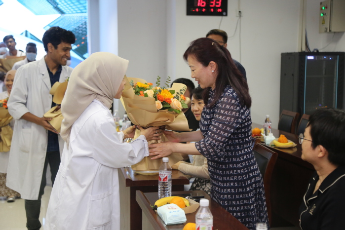 欢送迎新会在国际学生制作的短视频中拉开序幕,瞬间将在场的师生的记忆拉回到一年前,那时他们刚刚踏上临床见实习,怀揣着医学梦想,他们走进了新乡市第二人民医院。王志方代表医院致辞,他首先对37名国际学生能够圆满完成临床实习表示祝贺,他们在临床实习阶段的表现得到了老师们的充分肯定;同时他对即将进入医院见实习的国际学生表示热烈欢迎。他指出,随着中国经济的不断发展,来华留学教育作为高等教育的重要组成部分,医院能够参与到其中,也为医院医学教育掀开了新篇章。他希望同学们互惠互通,加强交流,珍惜自己在中国的所见、所闻、所感,讲好中国留学故事,传播中国声音。接着学校外事部负责人卢明臣对新乡市第二人民医院表达了感谢,感谢医院一路走来一如既往的理解和支持。闫吉霞、李广丽及教师代表纷纷发言,衷心祝愿圆满完成实习任务的国际学生前程似锦,一路繁花,随时欢迎常回家看看;对即将踏入医院见实习的国际学生,希望他们接下来一年学有所成。