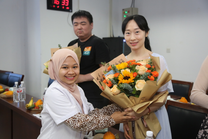 最后,在中国传统节日--端午节来临之际,师生共聚,共同品尝中国传统美食-粽子,2018级学生代表分别向临床带教老师献花,祝愿老师们端午安康。
