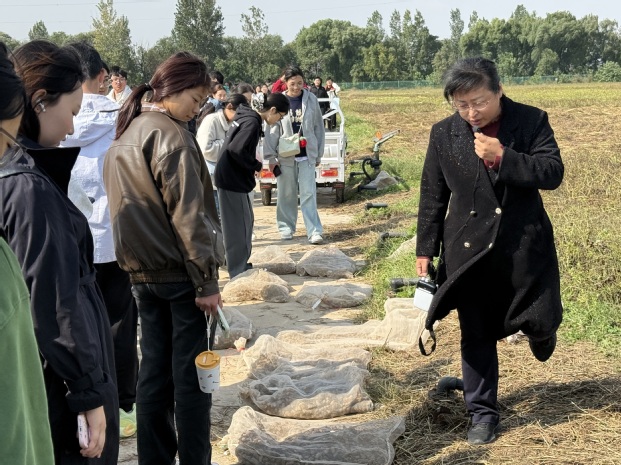 活动伊始,刘娟在实验田现场带给同学们一场深入浅出的主题讲座。她结合自身在农业科研一线的丰富经验,阐述了现代生命科学技术在农作物育种、病虫害防治及品质改良中的关键作用;特别以花生、大豆等主要经济作物为例,揭示了生物技术与国家粮食安全、人民健康生活的内在联系。刘娟强调,生命科学的研究虽始于微观,但其成果最终将服务于宏观的人类健康与社会发展,勉励同学们要打好理论基础,勇于探索未知。