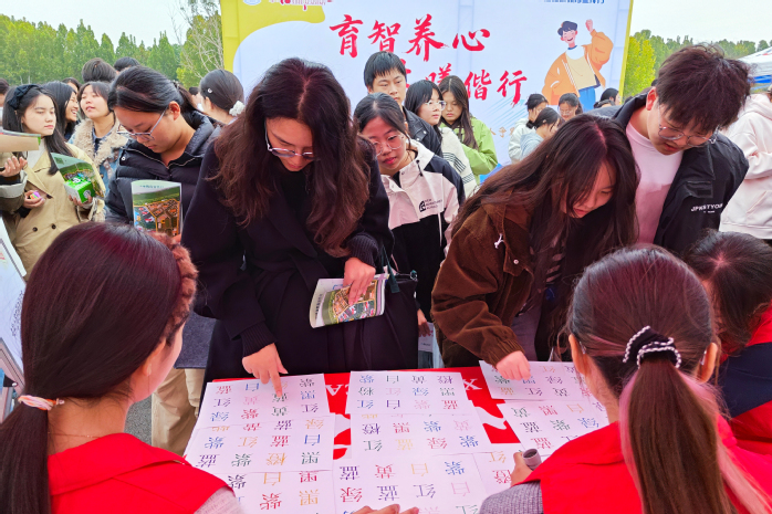 不少同学围在“色彩陷阱大突围”规则展板前,看完规则便立刻加入队列,抢答声此起彼伏。有的同学因脱口说错挠头大笑,也有的同学因全对通关而振臂欢呼,现场充满着欢声笑语。获得奖品的武金玉同学笑着分享:“特别考验反应力!明明看着是蓝色的字,脑子却总跟着‘红’这个字面跑,成功突破‘陷阱’就是最棒的。”