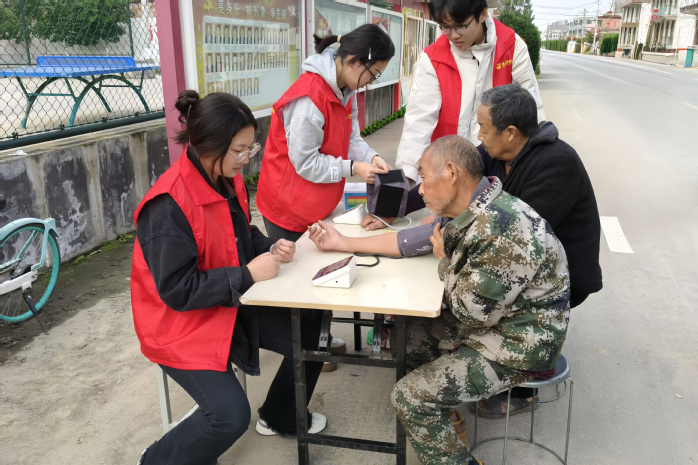社区阵地,义诊便民,筑牢健康防线。10月18日,姚村社区义诊活动现场暖意融融。志愿者以“义诊送健康,志愿暖人心”为目标,分组提供血压测量、健康科普、基础咨询等服务。大家结合测量数据为村民讲解健康注意事项,手持健康手册普及日常保健知识,累计为150余名村民提供服务。反复的讲解、细致的操作不仅未消磨同学们的热情,更让身为医学生的责任感在实践中愈发坚定,用专业与亲切筑起社区健康屏障。