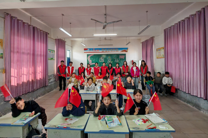 校园阵地,红染稚趣,播撒爱国种子。10月14日,志愿者走进姚村小学,以“红染稚趣,爱植童心”为主题开展校园服务。通过趣味科普实验、爱国互动问答等形式,用孩子们易懂的语言讲好中国故事。活动中,“我的爱国小目标是当一名科学家”“我要保护好我们的祖国”等稚嫩心声此起彼伏。最后全体师生在国旗下合影,为200余名小学生定格童年与信仰的珍贵记忆,让爱国种子在互动中悄然扎根。