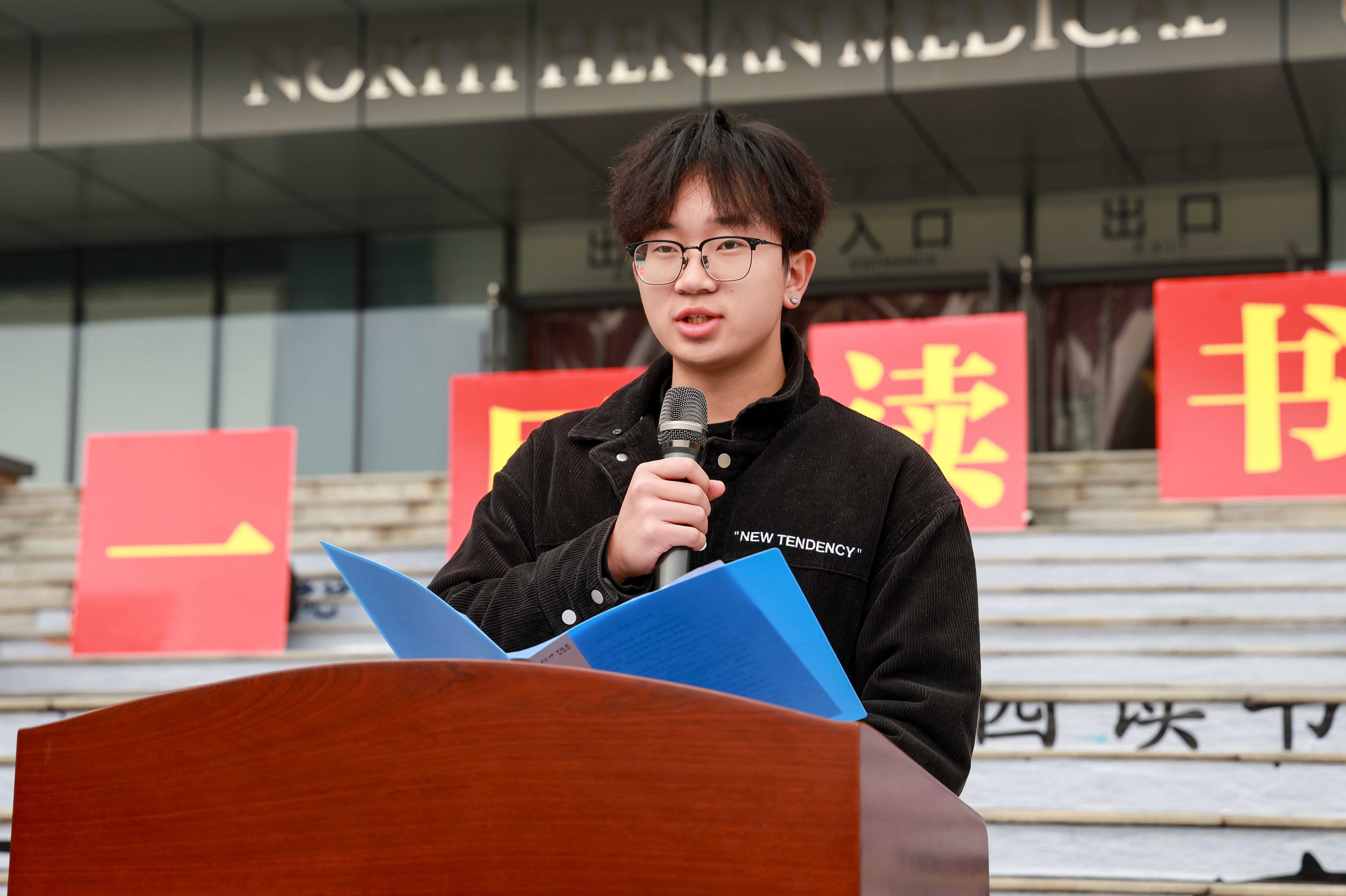 精诚书院2024级康复治疗学43班陈雨翔作为学生代表发言。他以真挚话语分享阅读感悟,他认为,阅读是获取知识的途径,更是沉淀自我、安放心灵的生活方式。同时,他向全体同学发出阅读倡议:将阅读视为青春责任与精神追寻,融入日常,终身践行;跳出兴趣舒适区,跨界涉猎构建完整知识图谱;不仅做知识接收者,更要成为思想对话者与文化传递者,以书为伴,在青春路上遇见更辽阔的风景。学生代表的发言赤诚恳切又饱含感染力,从容大方的仪态尽显新时代青年的朝气蓬勃。