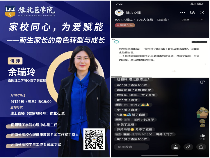 9月22日,我校成功举办“家校携手,同心护航”家长空中课堂,特邀河南省高校心理健康教育名师工作室主持人余瑞玲副教授担任主讲。课堂精准聚焦新生家长关切,围绕亲子分离、焦虑缓解与家校协同等议题提供专业指导,有效帮助家长科学应对子女大学阶段的成长挑战,为新生构筑坚实的家庭情感支持系统,进一步拓宽协同育人路径,凝聚家校共识,助力2025级学子顺利完成从依赖到独立的关键蜕变。