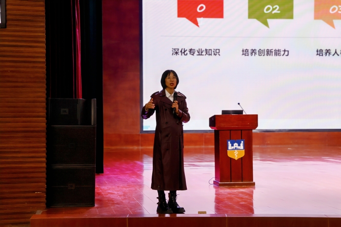 基础医学院常务副院长苗莹莹做了“大学生如何开展科学研究”的指导分享。她从一份具体的项目申报书入手,“手把手”教同学们如何确定选题,找准“问题靶点”,锚定前沿价值,并指出立项申请一定要有思路、有创新,结项报告一定要有价值,有意义,形成清晰的逻辑链条。