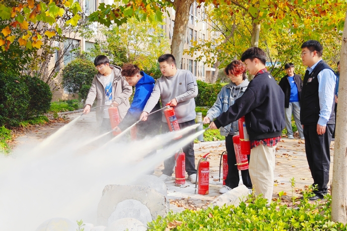 11月5日中午,各宿舍楼层长在张教员的指导下开展灭火器实操演练。“大家注意,灭火时要站在上风方向,距离火源2-3米,对准火焰根部喷射!”张教员拿起灭火器进行讲解。随后,学生们3人一组依次上前操作:拔保险销、握喷管前端、按压手柄……尽管初期有些手忙脚乱,但在反复练习后,多数同学已能熟练完成。