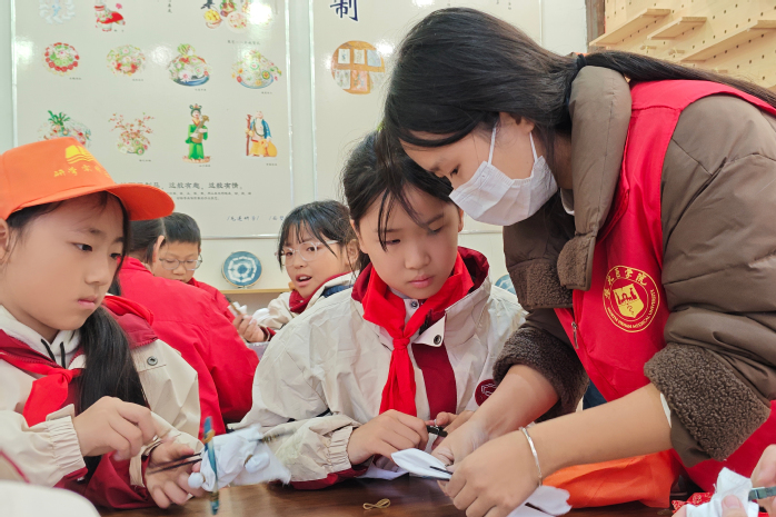 《文融·扎染》与《麦望·粮食画》体验现场创意十足。志愿者们详细拆解传统技艺的操作步骤,从扎染的捆扎、染色技巧,到粮食画的构图、粘贴方法,逐一耐心传授。孩子们发挥想象力与创造力,使白布在染料中晕染出独特花纹,将五彩谷物拼贴成精美画作,在动手实践中领略传统文化的独特韵味,提升了审美与动手能力。