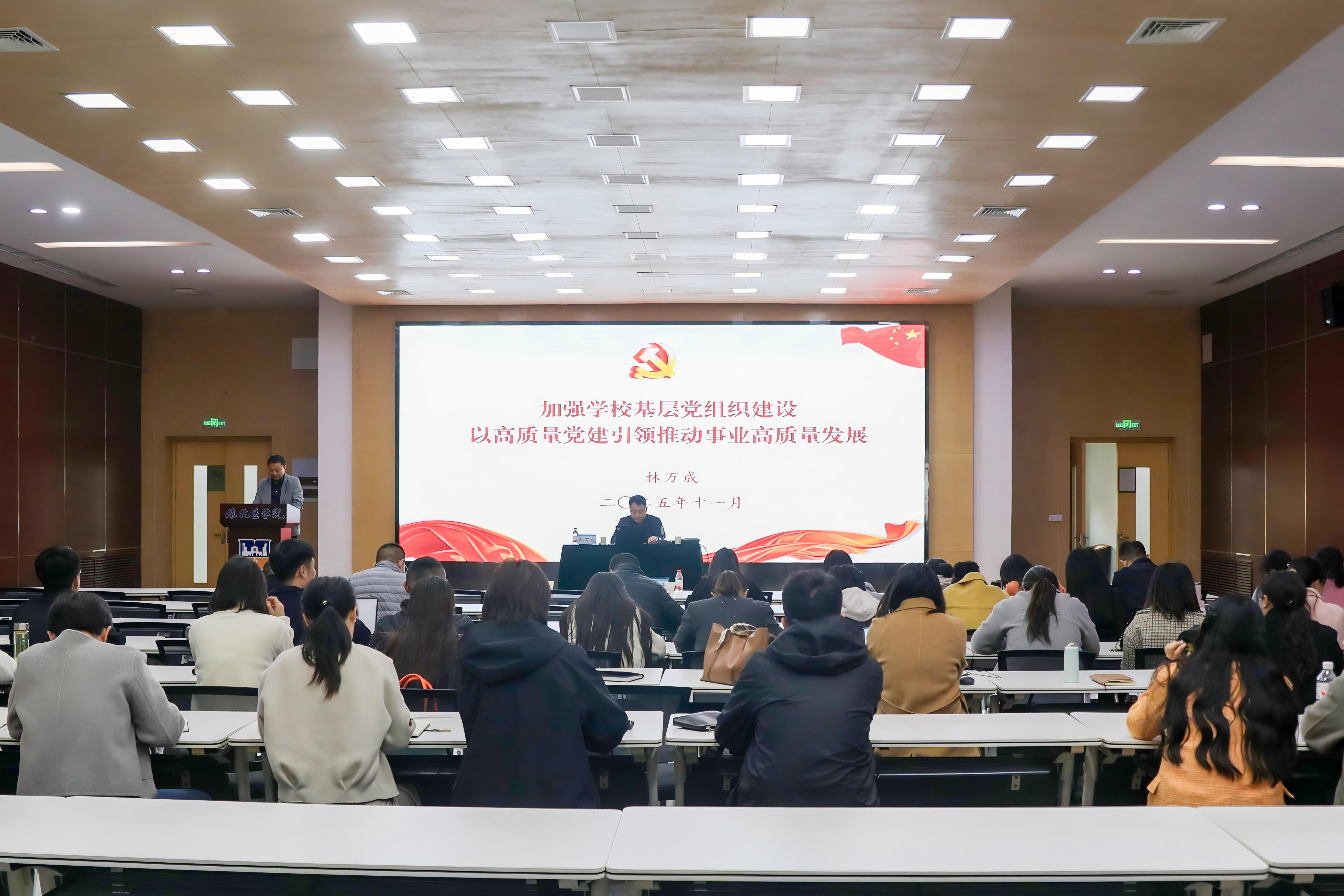 下午,河南财经政法大学党委巡察办副主任、历史学博士、马克思主义理论博士后、副教授林万成应邀作题为《加强学校基层党组织建设,以高质量党建引领推动事业高质量发展》的专题辅导。林万成围绕学校基层党组织建设的极端重要性、建强基层组织的路径方法、创建示范性基层党组织的实践要点等方面,系统阐释了新时代高校党建工作的理论逻辑与实践路径。他结合多年党建研究和政策实践,深入解读了基层党组织在政治引领、组织保障、推动发展等方面的关键作用,为参训人员提供了丰富的理论指导和实操借鉴。
