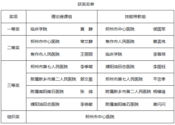 经过激烈角逐,竞赛最终评选出理论授课组和技能带教组一等奖各1名、二等奖各2名、三等奖各4名,并颁发优秀组织奖1个,以表彰在初赛组织与决赛中表现突出的教学单位。