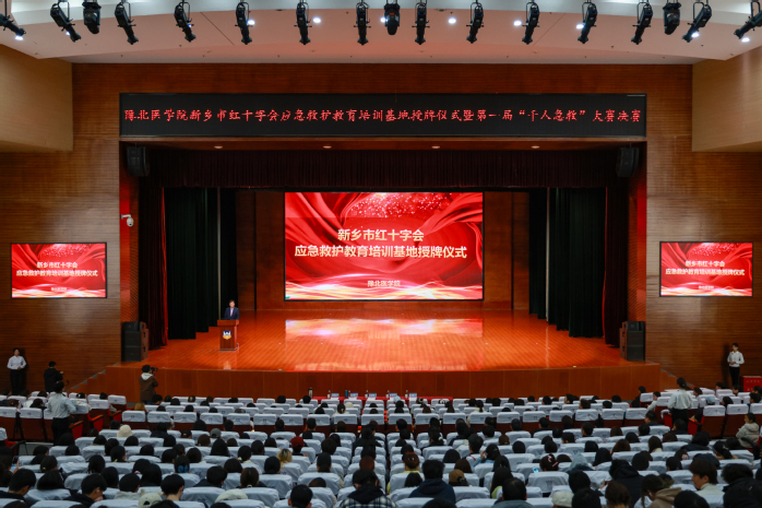 为深入践行“人民至上、生命至上”理念,将“人道、博爱、奉献”的红十字精神和“立德树人”根本任务深度融合,促进医学教育与人民健康事业紧密融合,11月19日,豫北医学院新乡市红十字会应急救护教育培训基地授牌仪式暨学校第一届“千人急救”大赛决赛在闻德礼堂隆重举行。河南省红十字会党组书记、常务副会长秦高亭,天津大学卫生应急学院科普培训基地主任辛立民,新乡市红十字会党组书记、常务副会长孙涛科,新乡市平原示范区管理委员会副主任宋泽银,我校董事长郭华伟、党委书记李庚、校长李琼、常务副校长秦国亮等校领导出席活动。相关行政部门、书院负责人及师生代表共计700余人参加。仪式由副校长马波主持。