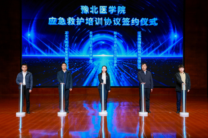 随后,李琼校长与新乡市平原示范区管理委员会、长垣烹饪职业技术学院、正大天晴药业集团股份有限公司、江苏恒瑞医药股份有限公司四家单位代表共同启动了应急救护培训合作共建仪式,标志着校地、校企协同育人迈出新步伐。