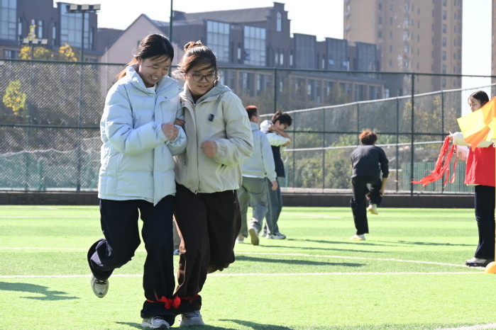 21日中午,“绑腿跑”比赛同样精彩纷呈。这项竞赛对室友间的默契度与协调性提出更高要求——参赛队员或两两搭档多人协同,相互扶持、步调一致,伴着响亮口号冲向终点。即便偶有队伍因步调偏差短暂停顿,队员们也能迅速调整、彼此鼓劲,坚持完成赛程,生动诠释了永不言弃的体育精神与深厚同窗情谊。