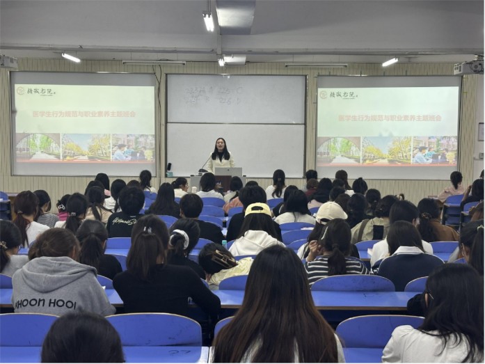 活动伊始,各年级辅导员组织召开“行为塑品”主题动员会,明确活动目标与要求。随后,同步开展“医学生行为规范与职业素养”主题班会结合案例解读医疗场景中的行为准则——从着装规范的严谨得体到实验室操作的安全守则,帮助学生树立职业敬畏心与规范意识。此外,朋辈导师姬明月,围绕自律、医风、时间管理、日常行为规范等内容分享,激发学生自律自觉,强化医风医德修养。