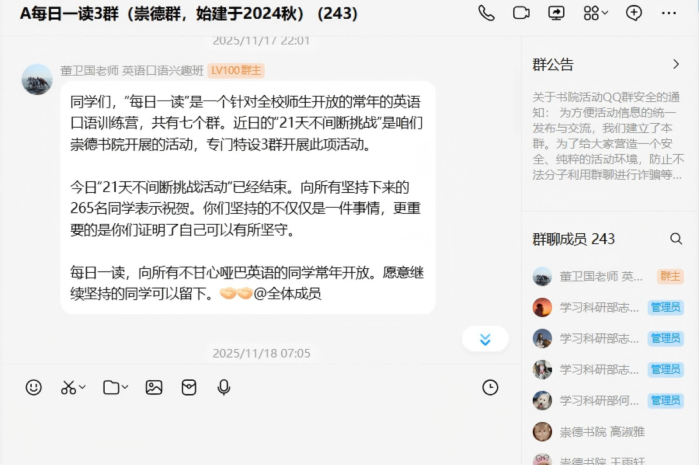 以“影”述情,以“笔”载智。本次学风建设两大亮点活动——“学在崇德,定格卓越”摄影大赛和“最美学习笔记”大赛引爆全场,收获了超乎预期的热烈反响。线上投票参与量、推文阅读量和互动量创书院新高,以影像与笔墨生动诠释卓越学风。同期开展的“21天·声声不息”英语口语打卡挑战,依托外国语学院教师董卫国的“每日一读”训练营,学员们通过持续朗读,突破“不敢读、读不准”的瓶颈,有效提升语言表达与学习毅力,营造出“以习惯促学风”的良好氛围。