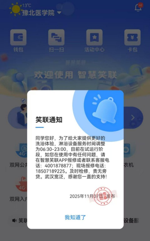 优化洗浴服务。为满足平原校区学生日常洗浴需求,提升后勤服务保障质效,平原校区学生宿舍热水淋浴系统升级调试工作已全面完成,该区域热水淋浴服务实行6:30—23:00 常态化供应。后勤处将持续畅通意见反馈渠道,精准归集师生诉求建议,动态优化系统运行参数与服务方案,以规范化举措筑牢服务保障防线,确保热水淋浴服务稳定、高效、优质,提升师生居住体验。