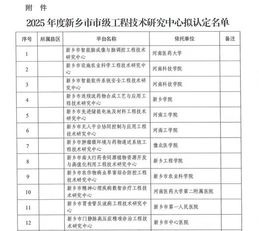 近日,新乡市科学技术局发布《关于认定2025年度新乡市市级工程技术研究中心的通知》(新科〔2025〕60号),正式公布了2025年度新乡市市级工程技术研究中心认定名单。豫北医学院申报的“新乡市肿瘤微环境与药物递送系统工程技术研究中心”成功获批。