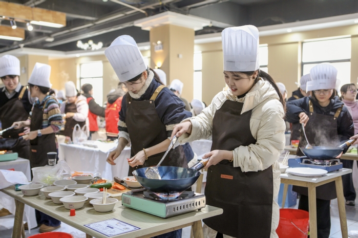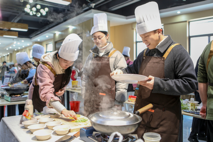 教职工组赛道为“创意赛道”,打破题材与食材的双重限制,让选手得以尽情释放巧思匠心,在锅碗瓢盆的碰撞间雕琢风味之韵,于方寸餐盘之上铺展创意之美。比赛现场,教职工选手从容不迫、技艺娴熟,30分钟内有条不紊完成洗切配炒、调味摆盘等操作,地方特色菜承载乡愁记忆,健康养生菜彰显生活智慧,尽显扎实烹饪功底与温馨生活气息。