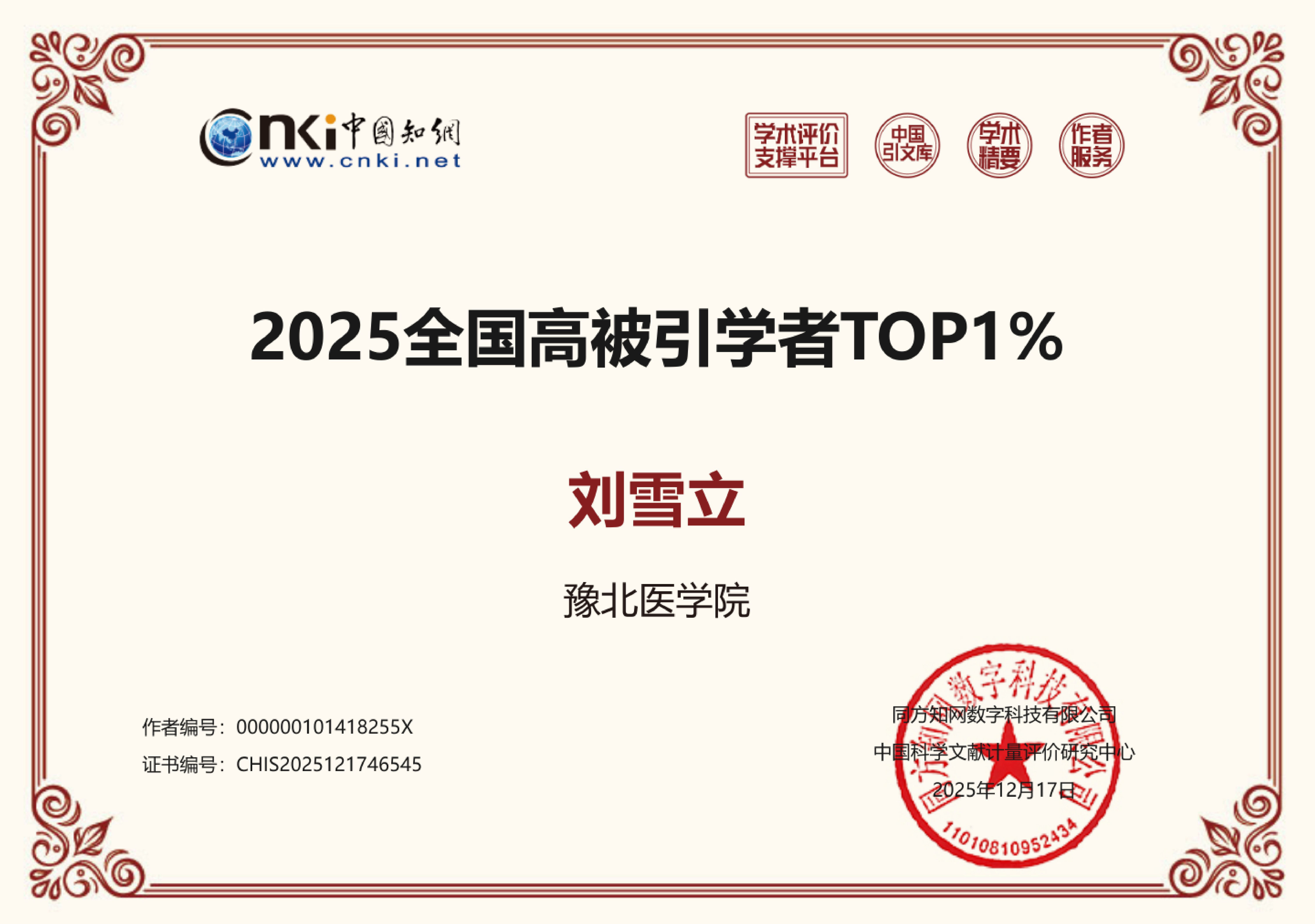 近日,从中国知网学术评价支撑平台获悉,我校图书馆馆长刘雪立教授入选中国知网信息资源管理(原图书情报与档案管理)学科2025年全国高被引学者Top1%。这是刘雪立连续两年入选全国高被引学者Top1%。
