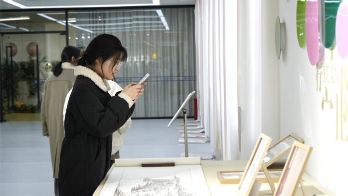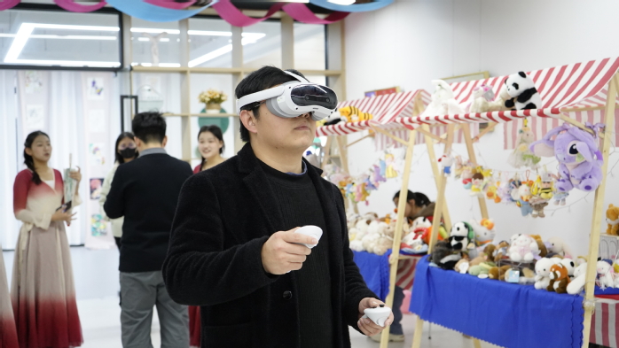 展览特别设置了VR艺术互动区与非遗手作体验区,构建了科技与传统相映成趣的美学对话空间。在VR艺术互动区,学生通过设备沉浸于多维艺术场景,探索虚拟与现实的创意融合;在非遗体验区,学生亲手参与掐丝珐琅、螺钿发簪等传统手工艺制作,在一针一线、一丝一缕中体悟匠心传承与宁静力量。一动一静、一新一古的体验感受,形成了张力与和谐并存的美育实践场景。