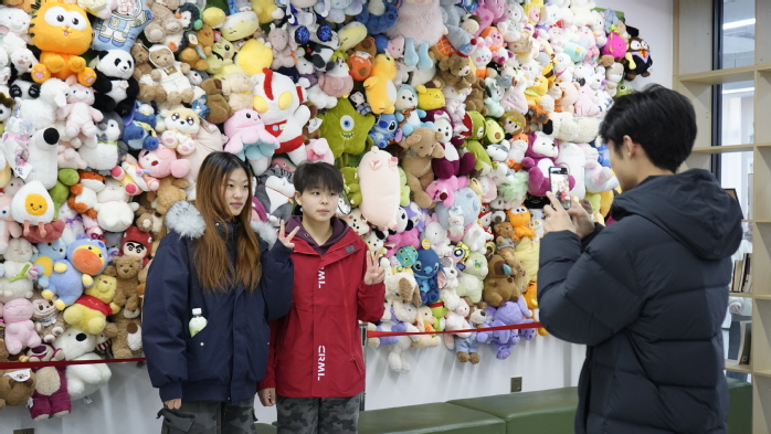 “娃娃能量墙”成为展览中最具情感温度的焦点。这面由仁智书院千余名学生自发“申请出战”的“仁智娃娃”,共同筑成一面充满故事与情感的装置墙娃娃墙吸引了许多同学驻足打卡拍照,更在社交平台掀起“圈图寻娃”的热潮,引发广泛的情感共鸣与转发互动。这种充满生命力的集体艺术装置,凝聚成温暖、支持、共情的社群象征,生动诠释了艺术创新表达。